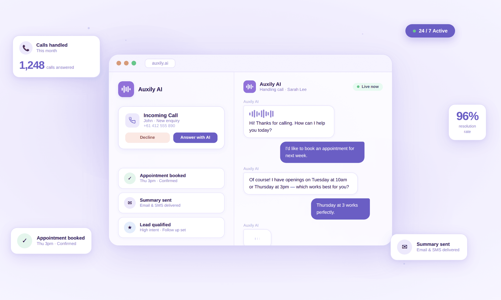 Auxily answers every call to your business, speaks naturally with customers, qualifies leads, and books appointments directly into your calendar.